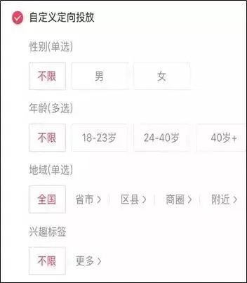 模式2:自定義投放,客戶自主選擇想要看到視頻的用戶類型:可以選擇性別、年齡、地域、附近商圈等方式。