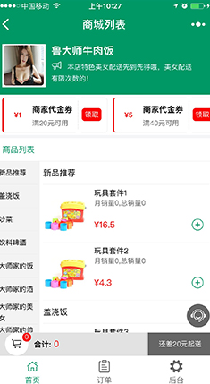 ??餓了嗎,美團等大型外賣點餐平臺紛紛轉向小程序平臺,甚至不惜貼錢等一系列措施來使app用戶、pc端客戶都轉向小程序上面來。可見,小程序平臺是多么的重要,是商家必爭之地。??龍兵小程序創建的外賣單店小程序能夠滿足大部分外賣商家的需求。走進外賣單店小程序商城列表頁面,可以看到新品推薦、蓋澆飯、炒菜、飲料啤酒等,這樣對于有困難選擇癥的用戶是個很好的體驗,同時新??店為了大力推廣小店,也配備了商家代金券。可快...